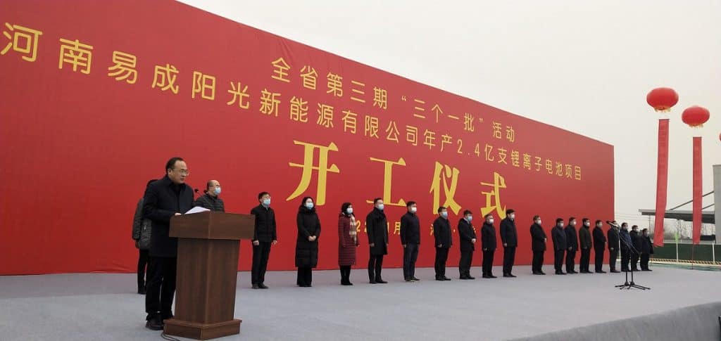 2022年1月4日,為貫徹黨的十九屆六中全會和中央、省委經(jīng)濟工作會議精神,全面落實省十一次黨代會部署要求,強化“項目為王”理念,積極響應(yīng)省委、省政府舉行全省第三期“三個一批”活動。河南易成陽光新能源有限公司年產(chǎn)2.4億支鋰離子電池項目開工儀式在新鄉(xiāng)市鳳泉區(qū)產(chǎn)業(yè)聚集區(qū)舉行,市委書記李衛(wèi)東、市長魏建平等出席活動。
